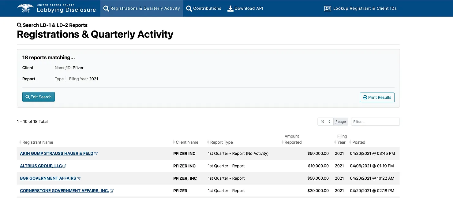 Different associations of manufacturers also list “patent issues” as the main focus of their lobbying effort. A single such association has registered 12 different lobbyists in Washington, DC. Another form also shows individuals working on “Trade Related Aspects of Intellectual Property Rights (TRIPS) Waiver.”
