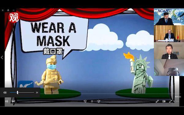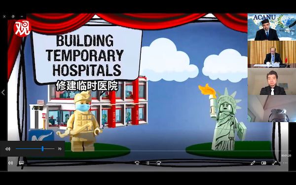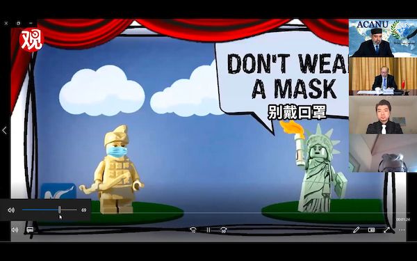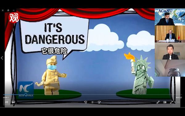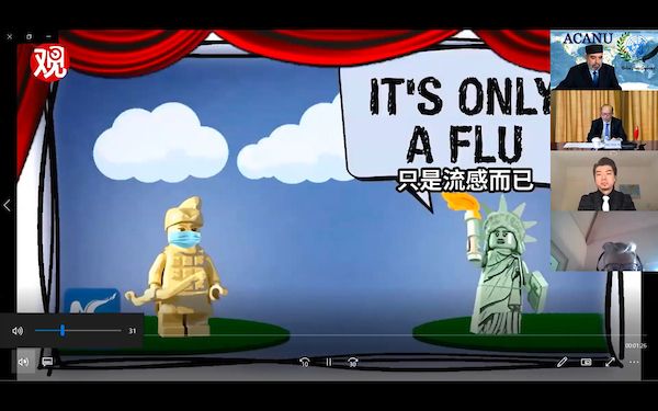 In Geneva, in front of the same journalists that Xi Jinping had cleared from the UN during his 2017 visit, the Wolf Warrior uses a propagandistic animated cartoon to denounce Washington’s mismanagement of the pandemic.
